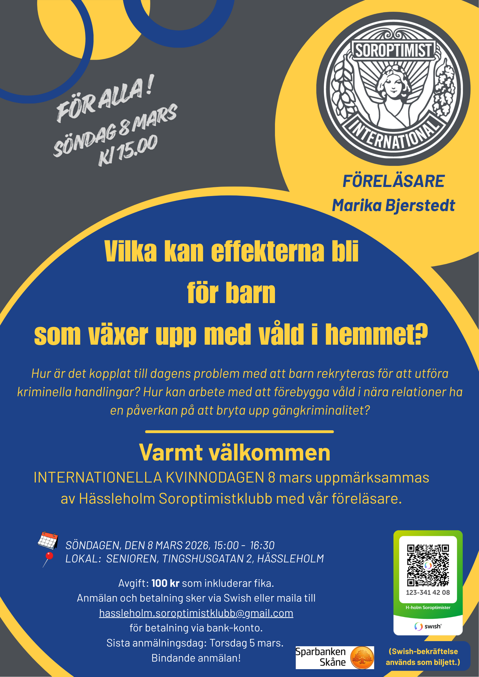 Varmt välkommen till att uppmärksamma Internationella Kvinnodagen med Hässleholms Soroptimistklubb och vår föreläsare Marika Bjerstedt. Ämnet för dagen är vad effekterna kan bli för barn som växer upp med våld i hemmet.